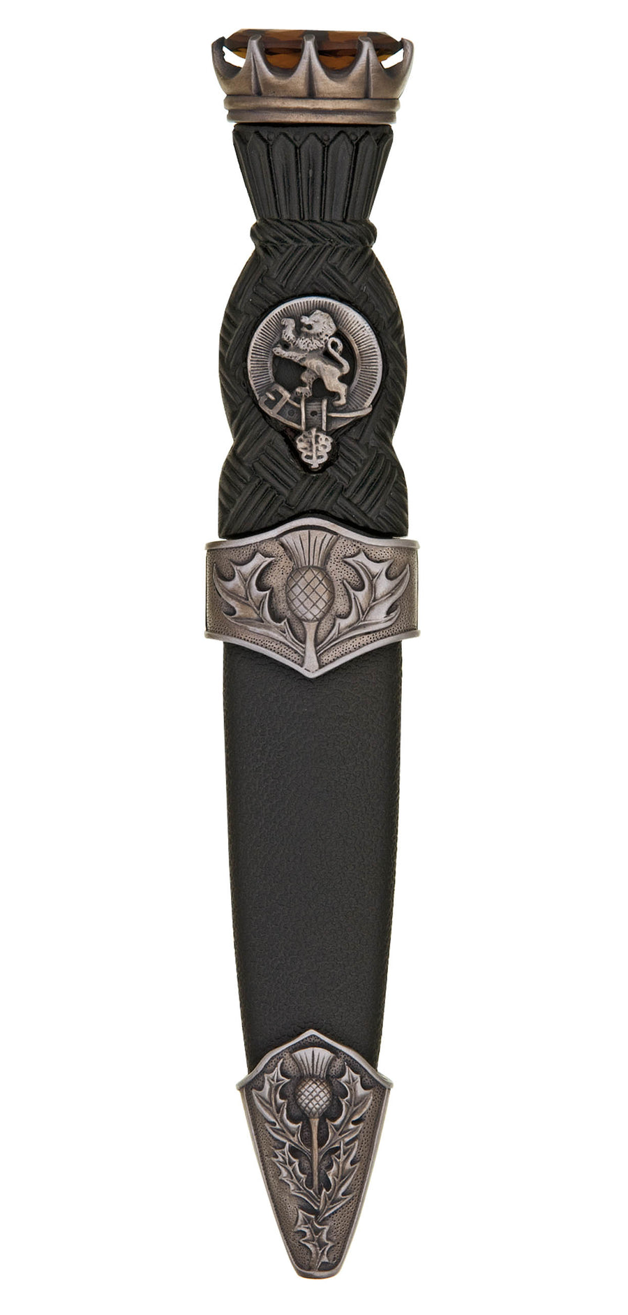 Clan crest sgian dubh. Available in a wide choice of family crests - see drop down menu below. There is also the choice of 6 stone tops - amethyst purple, blue, black, cairngorm amber, emerald and red. Please state preference upon checkout.