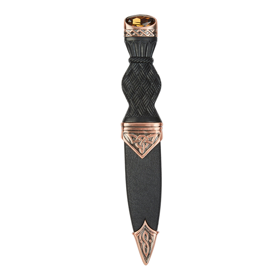 Copper Sgian Dubh with Celtic metal work design available with a choice of coloured stone tops. Comes in presentation box.