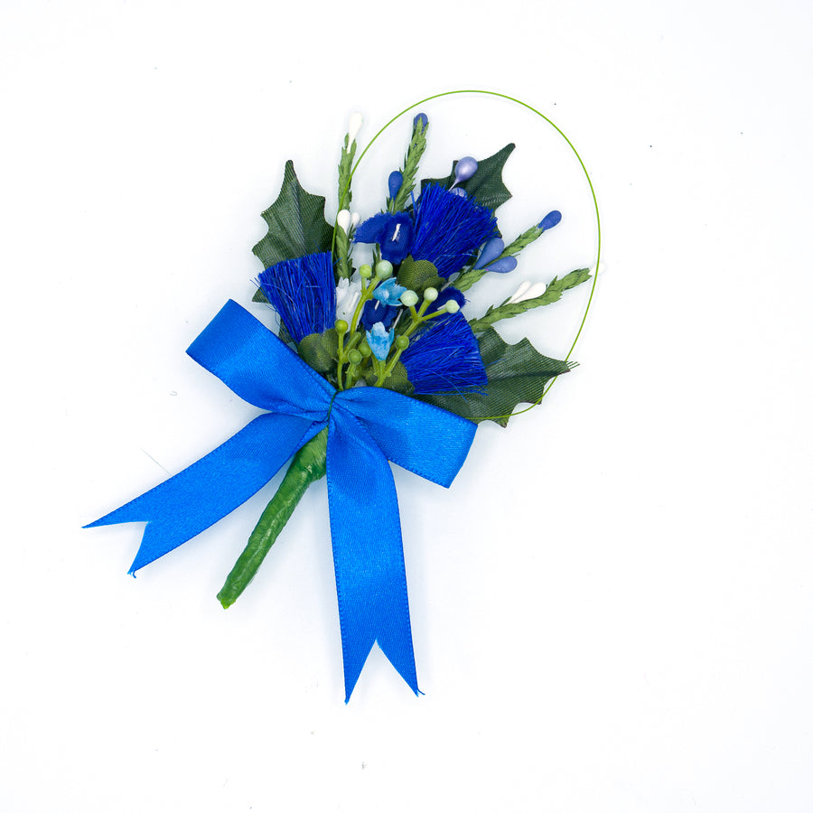 Artificial heather buttonhole with royal blue ribbon and attachment at back