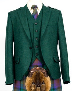 Evergreen tweed Crail jacket with black horn buttons and high cut 5 button waistcoat. Made in Scotland