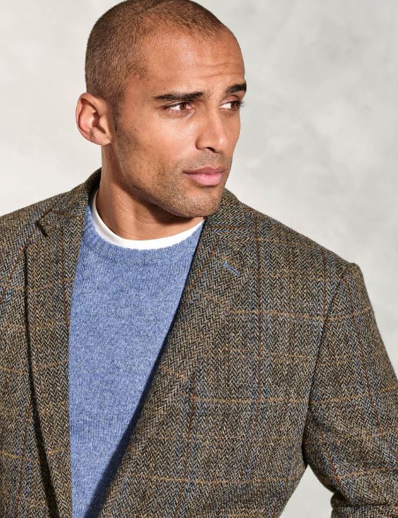 The Sumburgh Harris Tweed Single Breasted Jacket in a mid brown herringbone with blue and tan overstripe tailored fit jacket featuring elbow patches. A stylish 2 buttons, 4 button cuff, twin vent and angled pocket sports style jacket. Includes gold patterned lining features 3 internal pockets, and comes with a Harris Tweed Label of Authenticity.
