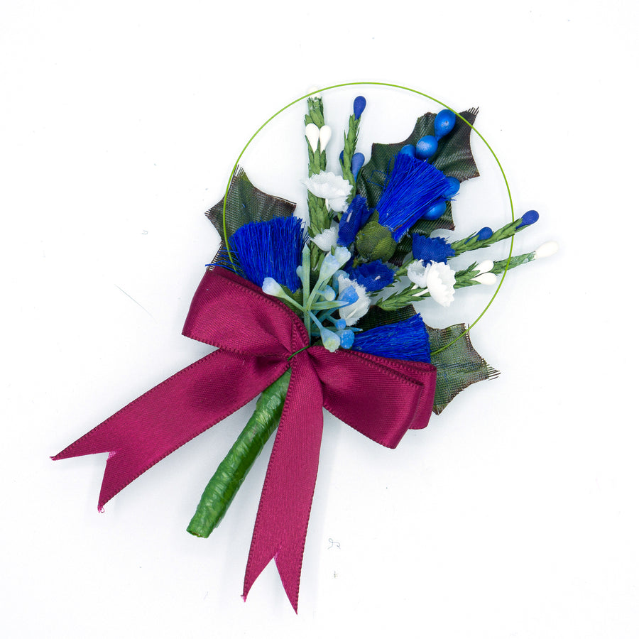 Artificial heather buttonhole with wine ribbon and attachment at back