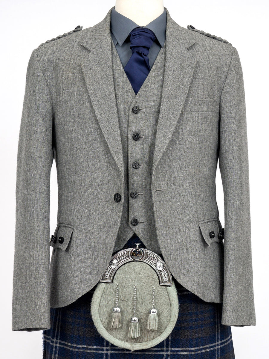 Light grey crail jacket with black horn buttons and high cut 5 button waistcoat.
