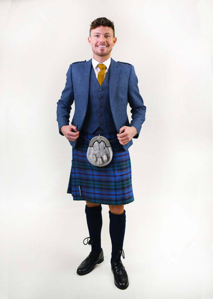 Lovat Blue tweed Crail jacket with stag horn buttons and high cut 5 button waistcoat. Made in Scotland