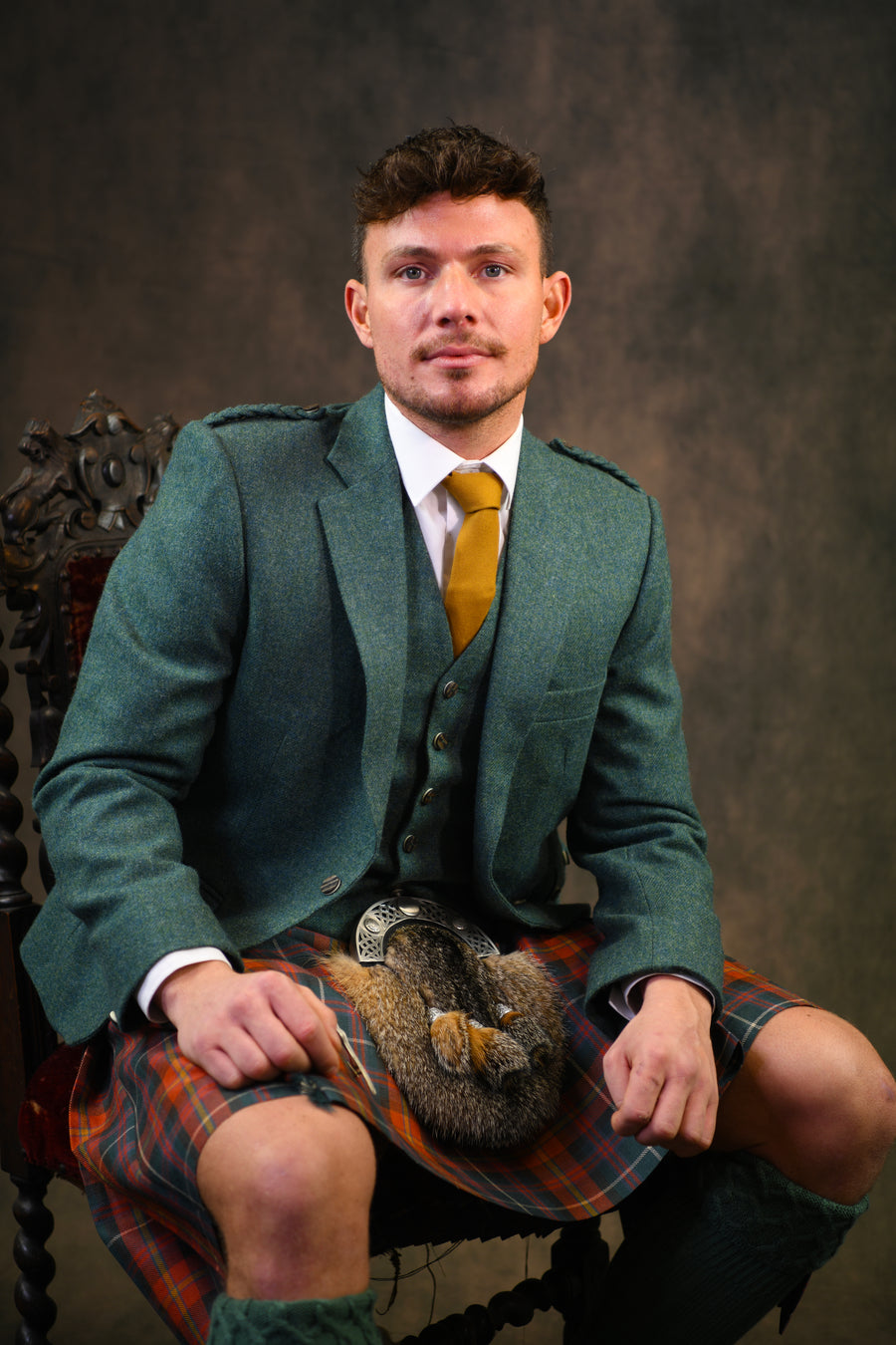Lovat Green tweed Crail jacket with stag horn buttons and high cut 5 button waistcoat. Made in Scotland