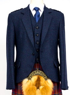 Midnight Blue tweed Crail jacket with black horn buttons and high cut 5 button waistcoat. Made in Scotland