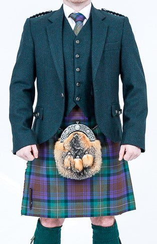 Cairngorm Ocean and Mallard green tweed crail jacket with brown stag horn buttons and high cut 5 button waistcoat. Other buttons and cuff options are available upon request