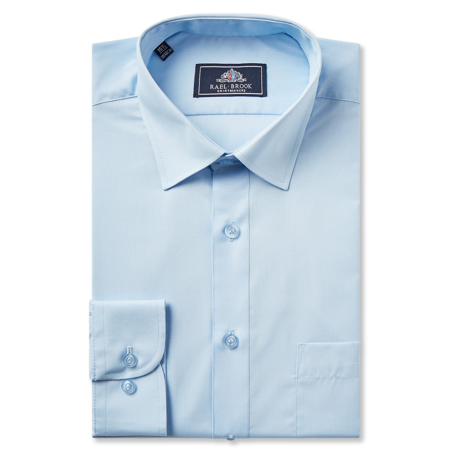 Powder blue standard collar dress shirt, single cuff and plain front. Ideal for wearing with a light grey or navy crail jacket.